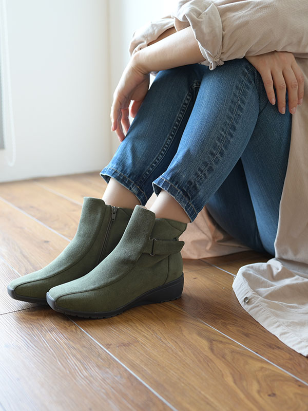 伸縮性のあるニット素材を履き口に使用した、ソックス感覚でスムーズに履けるショートブーツ